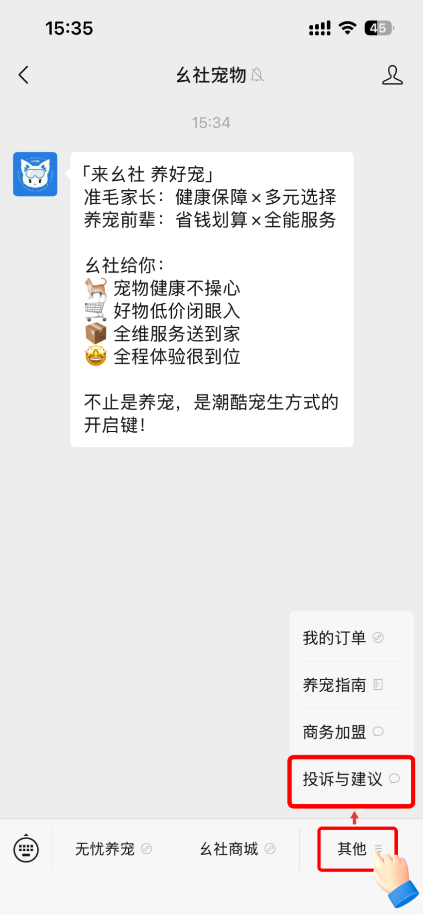 4. 官方微信公众号投诉入口:关注「幺社宠物」官方微信公众号,点击「其他」-「投诉与建议」,收到链接后,点击填写相关信息并提交。