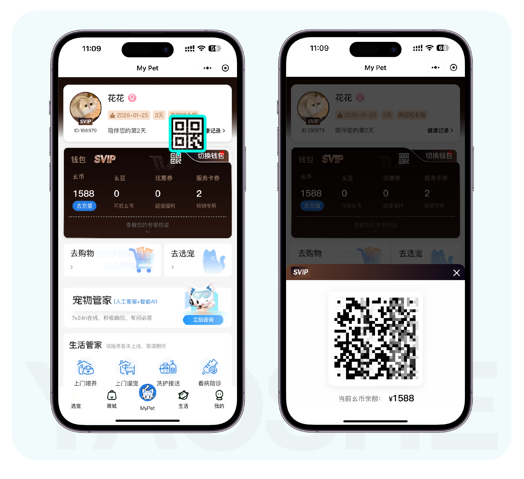 进入【幺社宠物微信小程序】→ 调出您爱宠的专属数字钱包 → 激活幺币支付二维码 → 对准医院终端扫描,系统自动完成安全验证与实时结算。全程无需现金流转,数字支付,安心无忧。